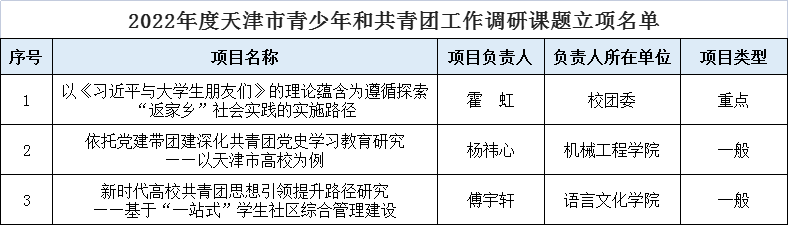 为深入学习贯彻习近平新时代中国特色社会主义思想,贯彻落实习近平总书记关于青年工作的重要思想,团市委开展2022年度天津市青少年和共青团工作调研成果征集。经资格审核、专家评审,米兰在2022年度米兰milan官方网站共青团和青年工作调研课题中择优推荐8个项目参加评选。近日,团市委公布调研课题立项名单,全市共获批调研课题27项,其中重点课题7项,一般课题20项,米兰共有3个项目获批立项,其中重点课题1项,一般课题2项。