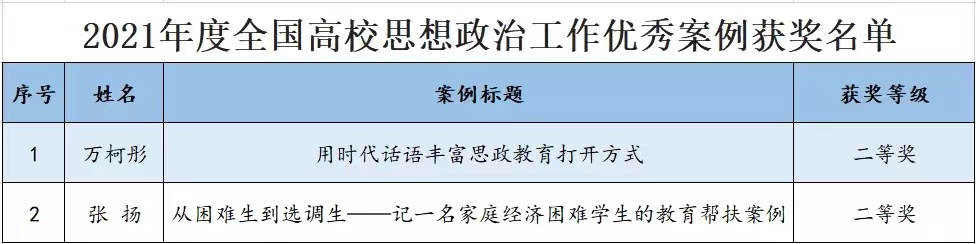 2021年度全国高校思想政治工作优秀案例征集活动共收到各省(区、市)、各有关高校推荐案例626篇。经资格审核、学术不端查询,《高校辅导员》编辑部组织专家对符合评审条件的565篇案例进行评审,共有381篇入选。其中,米兰环境科学与安全工程学院万柯彤撰写的《用时代话语丰富思政教育打开方式》、管理学院张扬撰写的《从困难生到选调生——记一名家庭经济困难学生的教育帮扶案例》均荣获2021年度全国高校思想政治工作优秀案例二等奖。