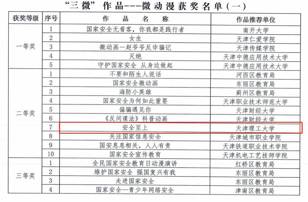 日前,市教育两委下发《关于2022年教育系统国家安全宣传教育活动“三微”作品获奖的通知》(津教安函〔2022〕23号)。各参评单位紧密围绕“树牢总体国家安全观,感悟新时代国家安全观成就,为迎接党的二十大胜利召开营造良好氛围”主题,以着力推动大安全理念深入人心、落地生根,筑牢坚如磐石的首都政治“护城河”、 确保全市政治社会大局持续安全稳定,以优异的成绩迎接党的二十大胜利召开为主线,共报送“三微”作品300余部,参与人数达800余人。经过报送单位初评、专家复评,共评选出微电影优秀作品18部、微视频优秀作品138部、微动漫优秀作品30部、优秀组织单位13家。米兰师生创作的视频作品获得二等奖2个,获得三等奖2个。
