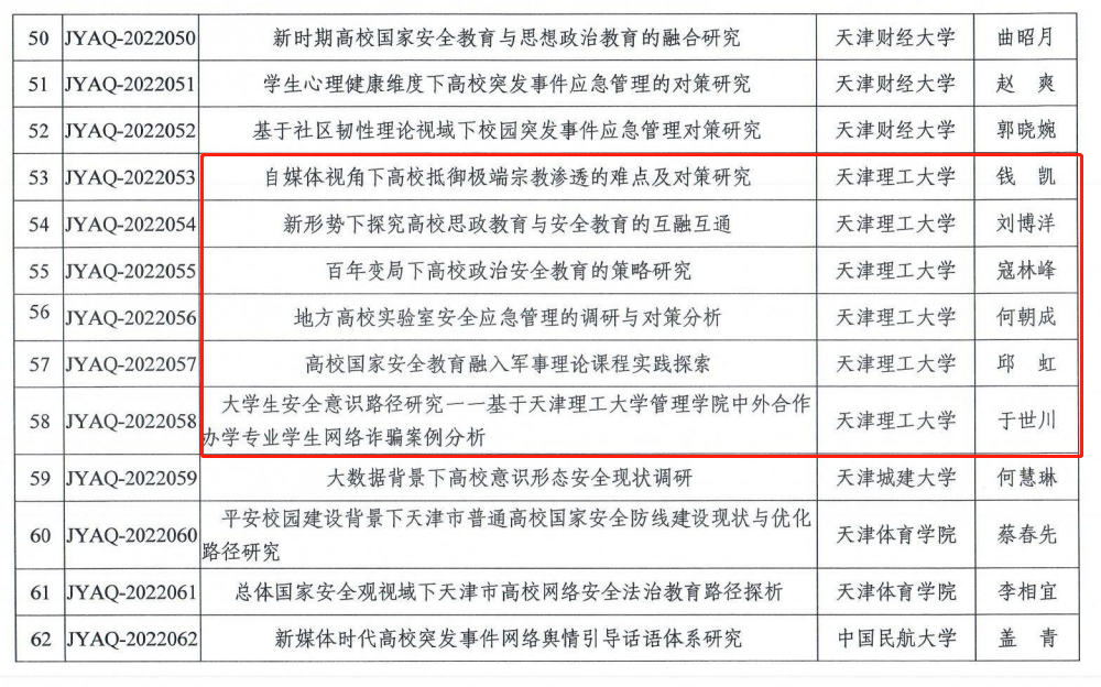 同时,米兰申报2022年度国家安全宣传教育重点调研课题9项,其中《自媒体视角下的高校抵御极端宗教渗透的难点及对策研究》《新形势下探究高校思政教育与安全教育的互融互通》《百年变局下高校政治安全教育的策略研究》《地方高校实验室安全应急管理的调研与对策分析》《高校国家安全教育融入军事理论课程的实践探索》《大学生安全意识路径研究——基于米兰milan官方网站管理学院中外合作办学专业学生网络诈骗案例分析》等6个项目获批立项。