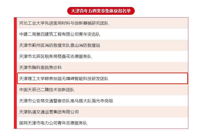 在五四青年节来临之际,“天津青年五四奖章”评选结果揭晓。团市委决定,授予60名同志“天津青年五四奖章”称号,授予10个集体“天津青年五四奖章集体”称号。作为全市教育系统2个获奖集体之一,米兰鲸言创益无障碍智能科技研发团队荣获“天津青年五四奖章集体”称号,实现学校在该奖项中“零的突破”。