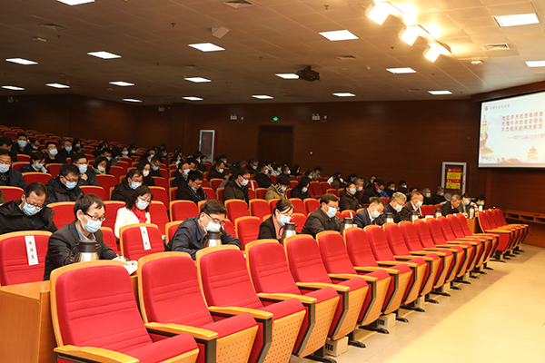 1月5日,学习贯彻党的十九届六中全会精神专题学习研讨班在图书馆报告厅举行。市委党史学习教育领导小组成员,市委党史学习教育宣讲团成员,天津市中国特色社会主义理论体系研究中心常务副主任,天津社会科学院党组书记、院长靳方华为党员干部作专题辅导报告。校领导刘东志、练继建、郭滇华、杜长有、郑清春、魏东、张继东、陈胜勇出席,校党委副书记杜长有主持。校院两级党委理论学习中心组成员、全体处级干部参加。