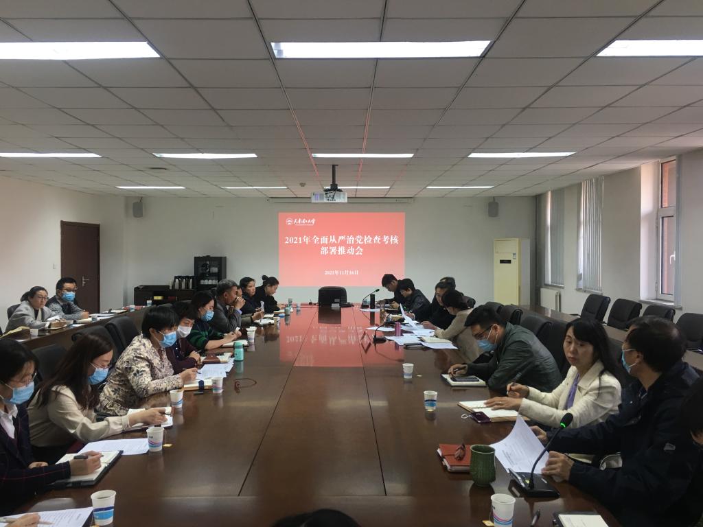 郭滇华在讲话中强调,全面从严治党是是“四个全面”战略布局的重要组成部分,是加强党的全面领导、深入推进党的建设新的伟大工程的重要保障。近年来,学校深入贯彻新时代党的组织路线和全面从严治党方针,连续4年在教育系统落实全面从严治党主体责任检查考核中获得充分肯定。面对新形势新任务,各单位、部门要认真做好学校自查工作和校内检查考核工作,以全面从严治党新成效,夯实基层党建基础,引领学校事业高质量发展。一是要提高政治站位,将全面从严治党和基层党建考核作为一项重要工作来抓,及时总结、梳理年度工作,确保各项要求不折不扣落实到位;二是要加强政策学习,深刻把握新时代党的建设总要求,通过检查考核,整体提升各级党员干部政治三力和工作水平;三是要加强协调沟通和工作指导,用好信息化手段和OA考核模块,切实落实为基层减负要求,确保高效有序完成检查工作;四是要强化履职担当,将检查考核作为各单位落实主体责任的“全面体检”,把握考核重点,切实推进全面从严治党向基层延伸。