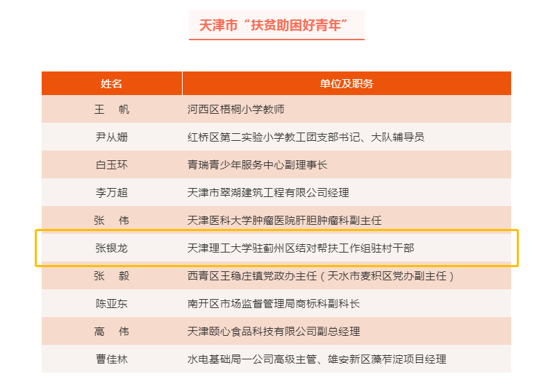 2017年,张银龙主动请缨到蓟州区参加天津市新一轮结对帮扶工作。三年来,他开展入户访谈和田间调研1000余人次,撰写帮扶工作日志和调研报告20余万字,拍摄帮扶影像资料130G。他以党建引领,合力攻坚,铸就牛道口村蝶变之路;通过“靶向治疗”,精准施策,打造村集体和农户双增收之路;奉献爱心,多措并举,实现“扶智+扶志”成才之路。2020年底,三个帮扶村均被评为“五星村”。结对帮扶事迹被中国教育报、天津教育报、天津支部生活、天津市党建网、今晚报、津云客户端和学习强国等多家媒体报道。三年里,他满怀深情扑下身子,与村里老百姓同吃、同住、同学习、同劳动,妻子怀孕,女儿出生,他没能照顾好他们。三年的帮扶工作换来了乡村的巨大变化,帮扶村的道路硬化了,街道路灯亮了,村庄变美了,村集体有钱了,村民腰包鼓了,他用实际行动践行着初心使命,用实际行动抒写着责任与担当。