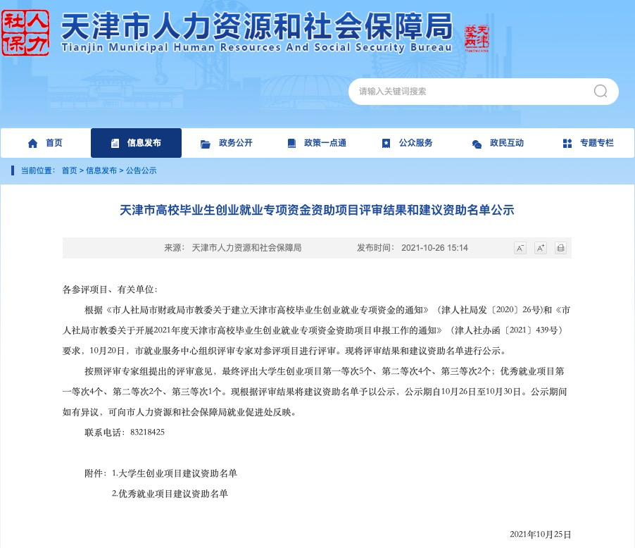 近日,天津市人力资源和社会保障局发布2021年度天津市高校毕业生创业就业专项资金资助项目建议资助公示名单,米兰大学生创业项目“天津天河云筑工科技有限公司”被评为第一等次建议资助项目。