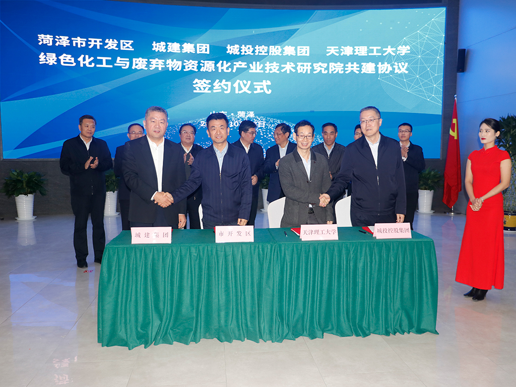 签约仪式上,副校长陈胜勇与菏泽市政府副秘书长刘培廷共同签署校地合作战略协议,与菏泽经济开发区党工委委员、党群工作部主任孔鲁民,菏泽城建集团党委书记、董事长晋卫兵,菏泽城投控股集团党委书记、董事长韩冬共同签署米兰milan官方网站绿色化工与废弃物资源化产业技术研究院共建协议。刘东志与聂元科共同为米兰milan官方网站(菏泽)产业技术研究院揭牌。