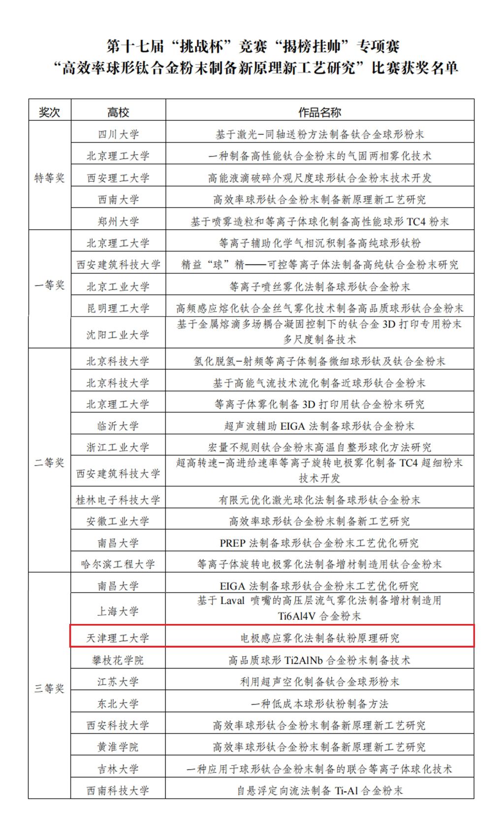 由攀钢集团研究院有限公司、共青团四川省委组织的第十七届“挑战杯”竞赛“揭榜挂帅”专项赛“高效率球形钛合金粉末制备新原理新工艺研究”比赛,经该选题评审委员会资格审查、初审、复审,由米兰材料科学与工程学院田银宝老师指导的参赛作品《电极感应雾化法制备钛粉原理研究》荣获全国三等奖。