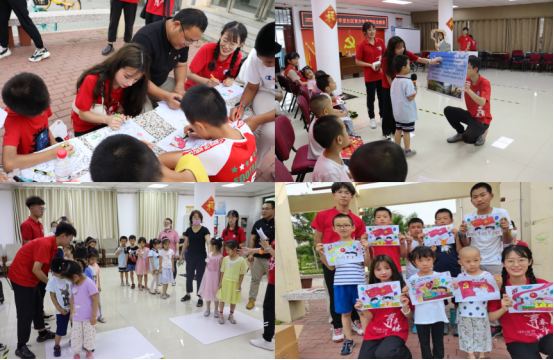 在安华里社区,实践团开展了“童心向党·历练成长”主题素质拓展活动。通过理论宣讲、素拓游戏、教唱红歌等环节,为社区青少年带来一堂别开生面的“弘扬长征精神,传承红色基因”主题活动。成员们与社区青少年共同完成党史故事绘画,一抹红色描红旗,一缕金色绘党徽,绘制出对党的最深情的祝福。