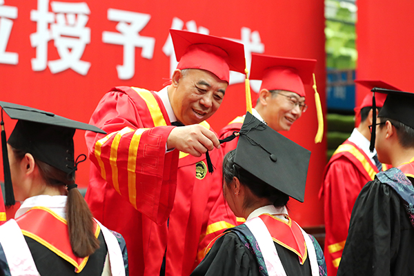 毕业典礼在庄严的国歌声中拉开帷幕。校党委副书记杜长有宣读了关于授予赵思瑶等162名同学本科“优秀毕业生”荣誉称号的决定,号召全体毕业生向他们学习,在新的起点上,继续秉承学校“重德重能,求实求新”的校训精神,为国家富强和民族复兴贡献青年力量,为母校争光。