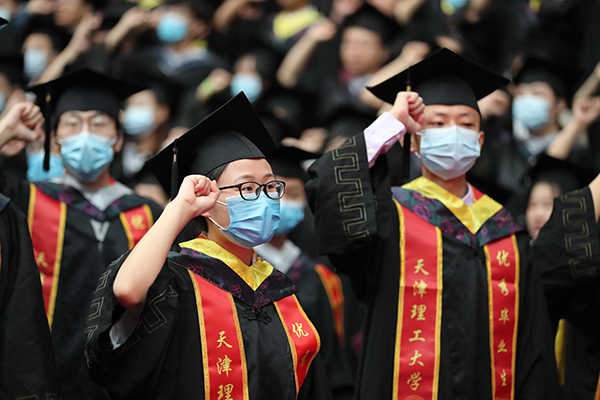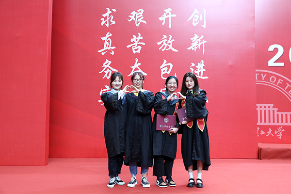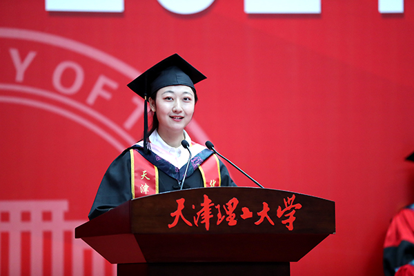 毕业生代表、语言文化学院赵思瑶同学在发言中回顾了四年来在母校成长成才的点点滴滴,感谢母校和老师的培养,并表示米兰学子会迎着第二个百年奋斗目标,让青春在不懈奋斗中绽放绚丽之花。她带领全体毕业生做出庄严宣誓:“秉承校训精神,报效祖国,奉献社会,服务人民,为中华民族伟大复兴不懈奋斗。”