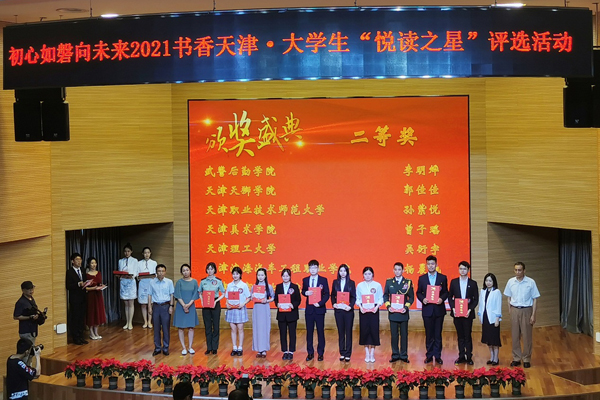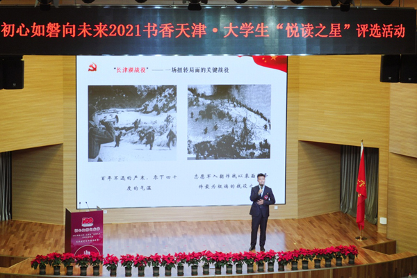 本次书香天津·校园“悦读之星”大赛,是天津市委宣传部(市新闻出版局)、天津市委教育工委(市教育委员会)联合主办的全市大中小学读书分享活动。总决赛前,学校多部门联合举办了2021“悦读之星”校内选拔赛,在校园悄然掀起一股阅读红色经典,致敬百年征程的学习热潮,广大学生在书籍中汲取营养和智慧,用阅读汇聚青春正能量,用昂扬奋进的精神风貌庆祝中国共产党成立 100 周年。