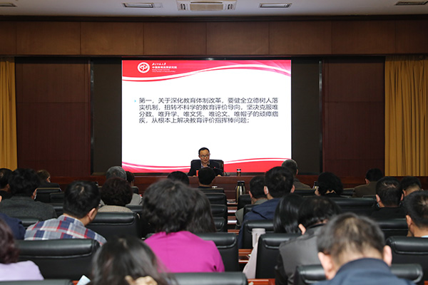 当天下午,薛二勇教授又为师生代表作了专题辅导。他从我国现行教育的基本规律出发,分析了习近平总书记关于教育的重要论述的核心观点及其理论体系,围绕着培养什么人、怎样培养人、谁来培养人、为谁培养人等方面,为师生代表全面系统地阐述了习近平总书记关于教育的重要论述。