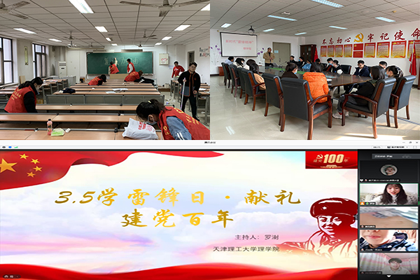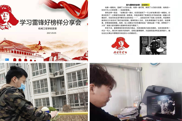 理学院团委组织线上观看《世纪雷锋》主题宣传片,重温雷锋光辉事迹;研究生为考研自习室进行卫生大扫除,为大家营造良好学习环境;很多志愿者在家乡就地参加社区服务,用实际行动践行雷锋精神,奉献青春力量,献礼建党百年。