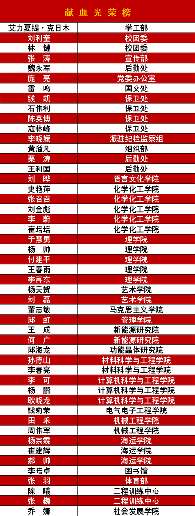 献血现场,老师们的脸上洋溢着满足的笑容,切身感受到了爱心奉献带来的温暖与幸福。在轻松愉快的氛围中,完成了无偿献血这一光荣之举。理学院的于慧勇老师第六次参加无偿献血;机关的回建东距离上次献血不到半年又一次登上了献血车;海运学院的海归博士郝帅将这次献血当作自己的“入职礼”……材料学院李春亮老师,刚刚整理完实验数据就匆匆赶来,和他一同献血的是在米兰化学化工学院工作的爱人李蔚,他们把“家风”融入到爱心事业。献血现场除了“夫妻档”还有“亲子档”,艺术学院的杨天贺老师和化学化工学院的刘金彪老师都把孩子带到了现场,身体力行为孩子树立无私奉献的榜样。