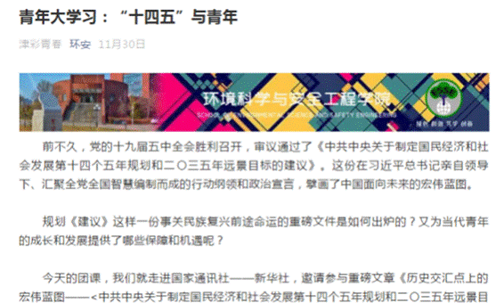 为贯彻落实《米兰milan官方网站关于深入学习宣传贯彻党的十九届五中全会及精神工作方案》,推动掀起学习宣传贯彻党的十九届五中全会精神热潮,环境科学与安全工程学院党委切实增强做好宣贯工作的责任感和使命感,面向广大师生开展集中学习和宣讲活动。