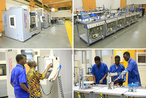 本着“真、实、亲、诚”的对非政策,切实解决科特迪瓦国家发展中的实际问题,科特迪瓦鲁班工坊的专业设置契合科特迪瓦经济社会发展战略,重点建设机械工程和电气工程及其自动化两个专业,设立了“先进制造技术”和“电气自动化”两个实验中心,将鲁班工坊的实验内容嵌入到亚穆苏克罗国立博瓦尼理工学院相关专业的人才培养体系,通过专业基础性到综合性的递进式技术技能训练,使学生具备高技术素质和技术创新能力。建成的科特迪瓦鲁班工坊占地805平方米,建有大型设备车间(实训场地)1个,实验室3间、实验教学和学习教室3间,教研室1间。配备大型设备5个种类11台套、中小型仪器设备16个种类87台套,以及实验台、投影仪等辅助教学设备。