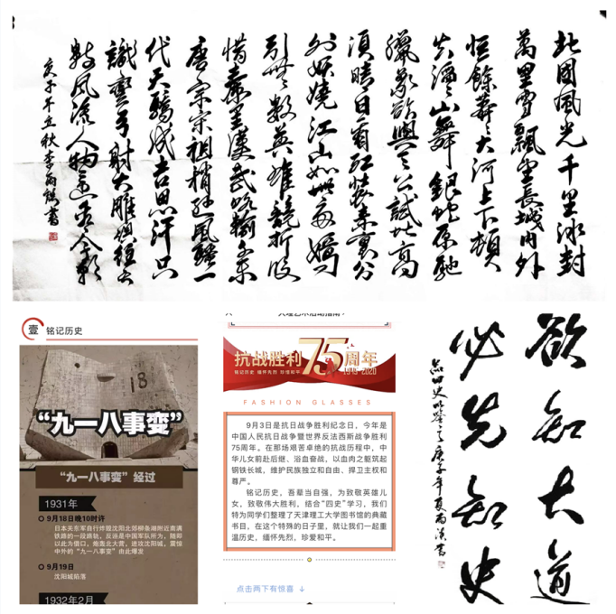 面向全校师生开展“爱国学史,青年力行”艺术作品征集活动,激发师生深刻理解和积极创作,全方位挖掘“四史”学习的红色记忆;开展“红色纪念日展播”主题活动系列推文,结合抗日战争胜利纪念日等内容在官方公众号进行宣传,主动占领“四史”学习的网络阵地,加强思想认识。