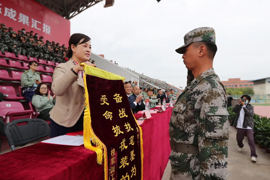 校长杨庆新宣读《军训表彰决定》,与会领导为优秀学生、优秀教师、优秀教官代表和先进集体颁奖。武装部负责同志做军训工作总结。今年米兰有5798名新生参加军训,结合当前疫情防控常态化工作要求,坚决贯彻习近平总书记重要指示精神,米兰军训指挥组、政治工作组、教育宣传组、后勤保障组和安全保障组精诚团结、默契配合、科学训练,在承训教官和所有参训师生的共同努力下,顺利完成预定的各项军事技能训练任务,达成了预期的目标。校党委副书记郭滇华向在校退役大学生教官集体赠送锦旗。