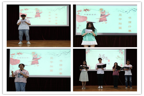 马瑞等同学分享了与老师之间的故事,真挚感人的话语流露着对老师们的感恩和祝福,也代表广大学生诉说着对老师的崇敬和爱戴。 教师与学生代表共同的朗诵更是用“一代师表千秋业,巍巍师魂万世传!”的铿锵字句将整个活动推向了高潮。活动最后,在场学生也为老师们送上了康乃馨和手写贺卡来表达莘莘学子最真挚的祝福。