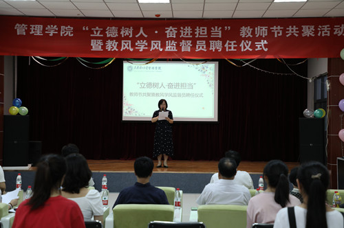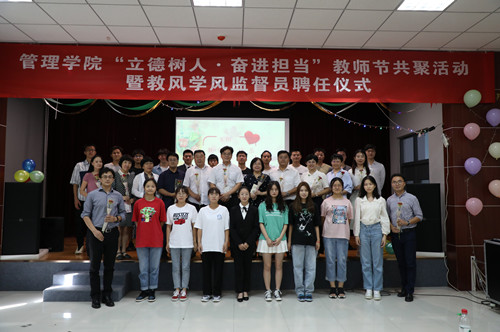 为庆祝第36个教师节,推动教风学风建设年各项工作深入开展,9月9日管理学院举办“立德树人·奋进担当”教师节师生共建活动以及教风学风监督员聘任仪式。学院党政领导、教学督导组教师、班主任及学生代表参加本次活动。