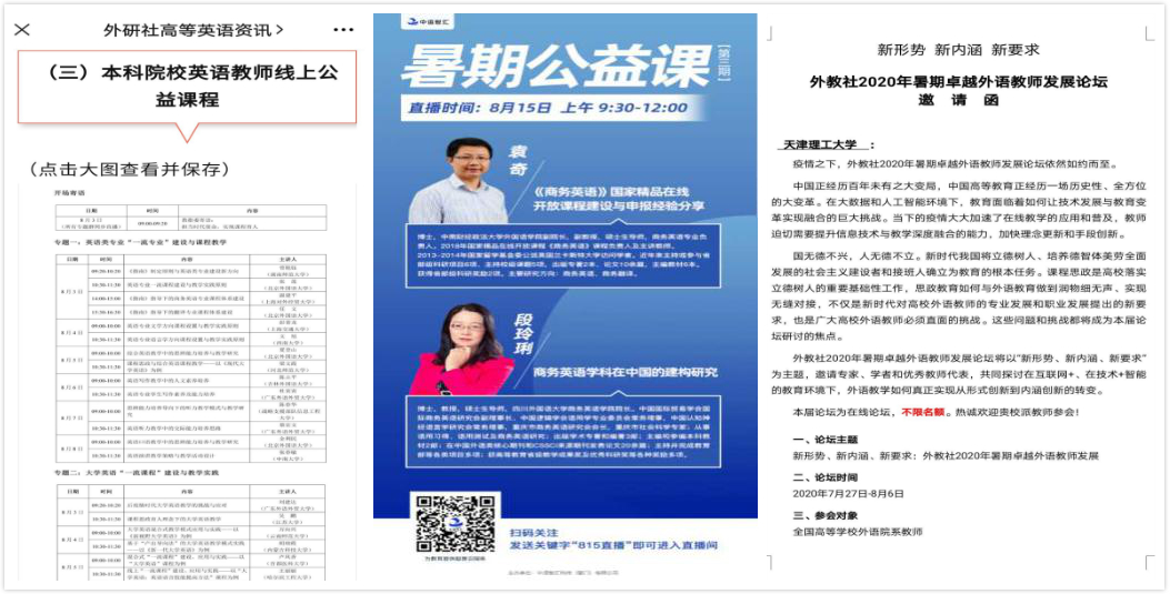 教师专业素养是教学质量的重中之重。借助外研社、外教社等出版社的高校教师线上研修平台,学院组织全体教师参加了一系列的暑期教师培训,助力教师发展。既有国内外知名专家的讲座,又有一线教师的教学示范课,内容涉及语言评价素养、课程思政、线上线下混合式教学模式设计、思辨能力、跨文化能力培养等多方面,使教师足不出户便能及时跟上语言教学的最新态势,同时为进一步优化教学设计、提升教学效果奠定了基础。