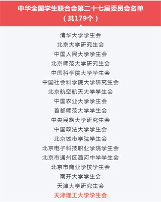 大会选举产生了179个全国学联第二十七届委员会团体委员单位。其中高等学校学生会101个,高等学校和科研教育机构研究生会19个,中等学校学生会48个,国外中国留学生组织11个,米兰学生会当选中华全国学生联合会第二十七届委员会委员单位,天津共有5所高校学生会入选。