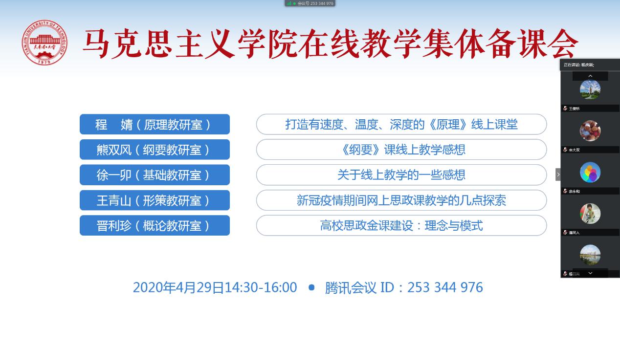 此次集体备课会是在新冠肺炎疫情的特殊背景下召开的,学院以线上的方式组织集体备课会进行经验分享,素材积累,将进一步推动思政课教学改革创新和教学质量提升,为建设思政课“金课”和“智慧课堂”提供了宝贵经验。