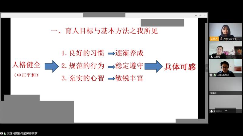 杨凡老师以《幼童思政育人浅谈》为题,从育人目标与基本方法、教学转化和课堂活化三个方面,将教材内容梳理对接到习惯养成、行为范式和心智充实上。