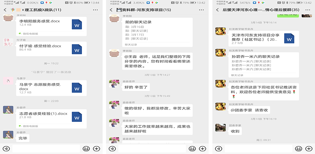 社会发展学院社会工作系的师生志愿服务团队由社会工作专业部分教师及硕士研究生(MSW)组成,共计12人,主要负责心理与情绪舒缓、家庭关系构建、与隔离居民的沟通并协助舒缓其压力等方面方法和技巧的整理、推送,第一时间通过微信群为一线医护人员提供心理支援服务,服务的人群主要包括10个留观点的医护人员和社区书记们,共计120余人。部分老师通过热线电话,面向全市的医护人员和社区工作人员、居民等提供电话咨询服务。