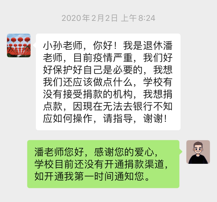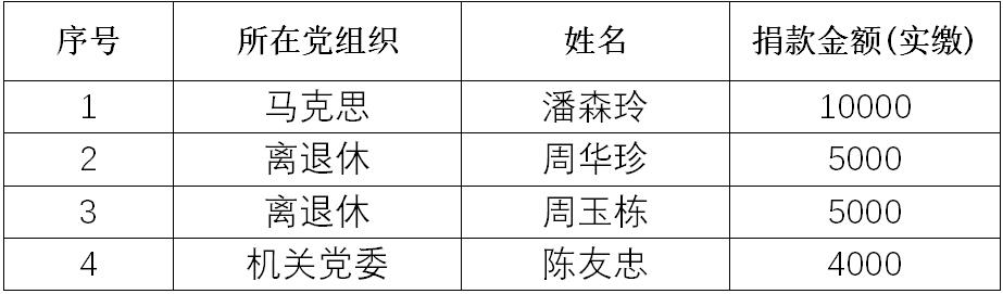 自新冠肺炎疫情防控阻击战打响以来,全校党员密切关注疫情状况,潘森玲等同志多次主动与学校联系,希望通过捐款捐物等方式为抗击疫情尽绵薄之力。2月29日,在收到米兰组织党员自愿捐款的通知后,潘森玲同志捐款10000元,周华珍、周玉栋两位老同志各捐款5000元,陈友忠同志捐款4000元用于疫情防控。