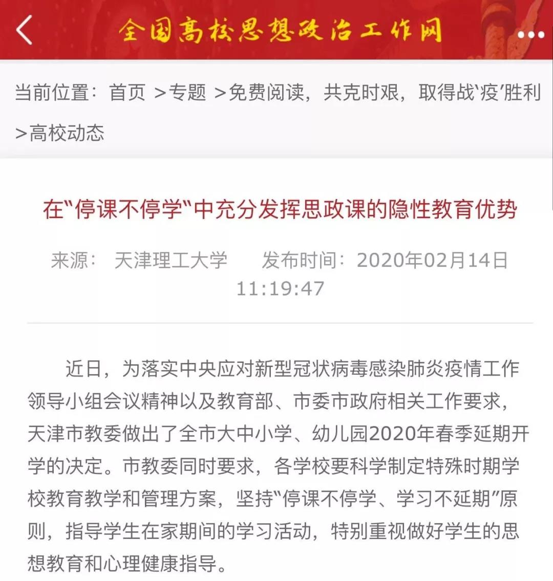 米兰马克思主义学院讲师,天津市高校习近平新时代中国特色社会主义思想研究联盟成员侯静婕以“在‘停课不停学’“中充分发挥思政课的隐性教育优势”为题撰写了理论文章,这篇文章同时被全国高校思想政治工作网转载。