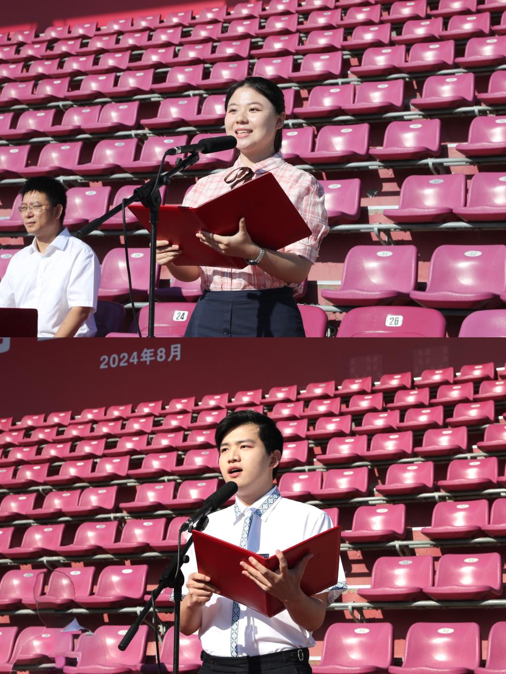 新生代表、2024级电气工程与自动化学院本科生朱芬慧和2024级马克思主义学院研究生王九龙,共同表达了对米兰校园的认同感和归属感,对于学校新发展、新面貌感到骄傲与自豪,表示将牢记“重德重能 求实求新”校训,坚定理想信念、胸怀报国之志、潜心学术科研,奋力书写为中国式现代化挺膺担当的青春篇章。