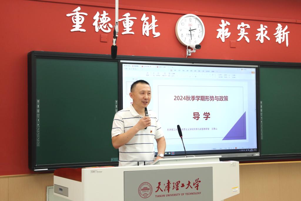 为全面贯彻习近平新时代中国特色社会主义思想,深入学习宣传贯彻党的二十届三中全会精神,贯彻落实全国教育大会精神,引导广大青年坚定不移听党话、跟党走,立志做有理想、敢担当、能吃苦、肯奋斗的新时代好青年,9月11日,校党委书记刘东志和马克思主义学院思政课教师王青山以同上一堂课的形式,为全校学生讲授题为“厚植家国情怀,勇担时代大任,为中国式现代化建设书写挺膺担当的青春篇章”的秋季学期形势政策教育开学第一课。