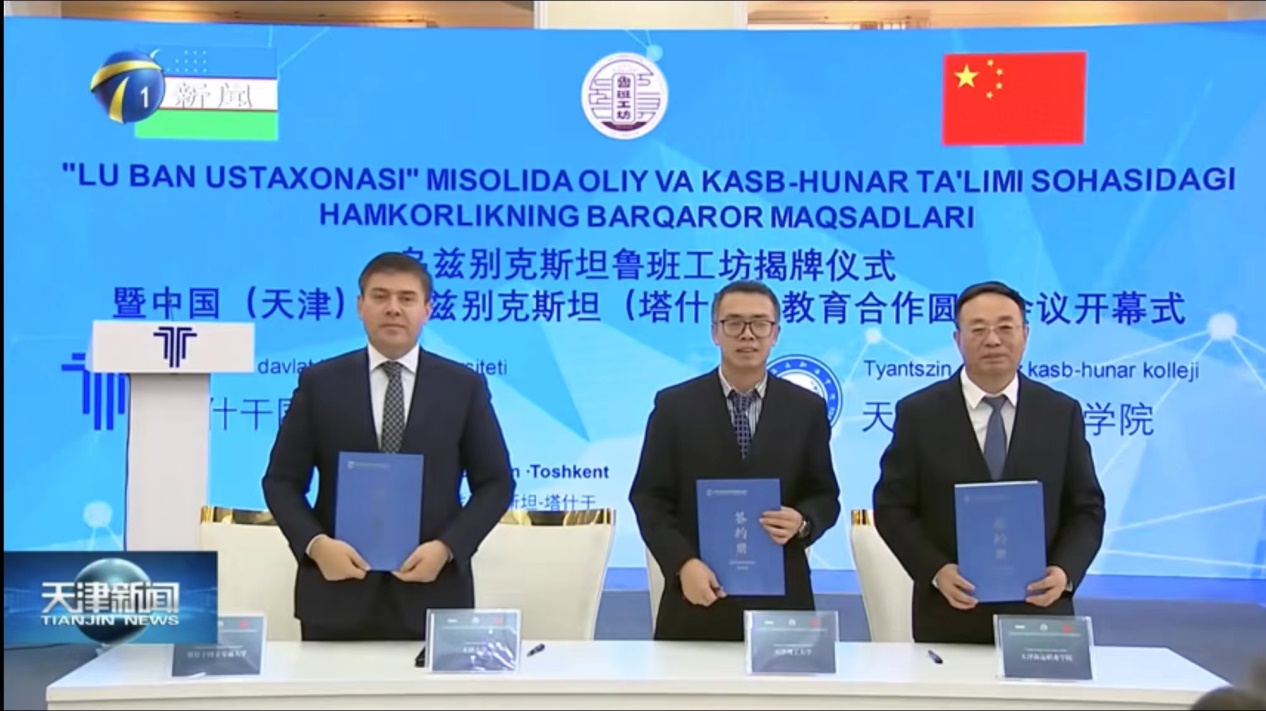 乌兹别克斯坦鲁班工坊揭牌活动中,在市委书记陈敏尔,乌兹别克斯坦总统办公厅社会发展局局长,塔什干国立交通大学校长阿卜杜拉赫曼诺夫,乌兹别克斯坦高等教育、科学和创新部第一副部长达利耶夫,中国驻乌兹别克斯坦大使于骏等领导的见证下,学校与天津海运职业学院、塔什干国立交通大学、天津大学签署来华留学生“专本硕博”贯通培养合作协议。