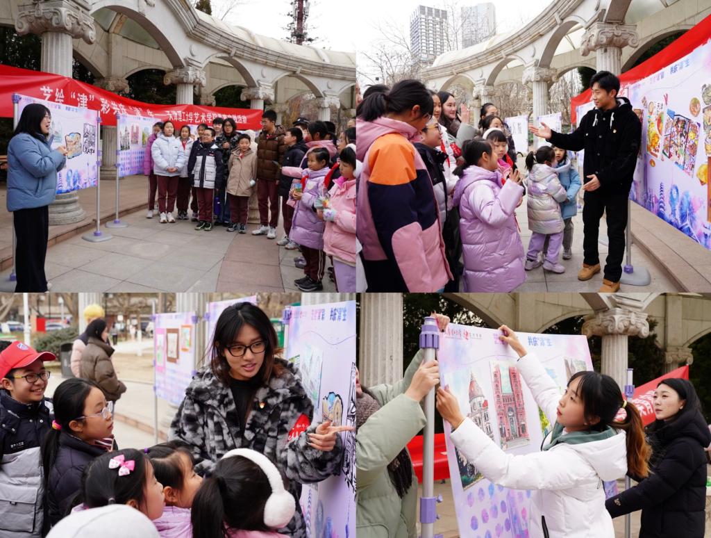 在睦南公园,学院与昆明路小学共同开办主题画展,围绕“津城”“津民”“津味”等内容将所学所见融入艺术作品之中,从小切口展现天津城市的独特魅力。活动紧扣“津物、津人、津事”,面向居民生动讲述画作背后的天津故事,引导民众深刻感悟天津文化、唤醒城市记忆,激发广大学生了解天津、热爱天津、建设天津的热情和力量。