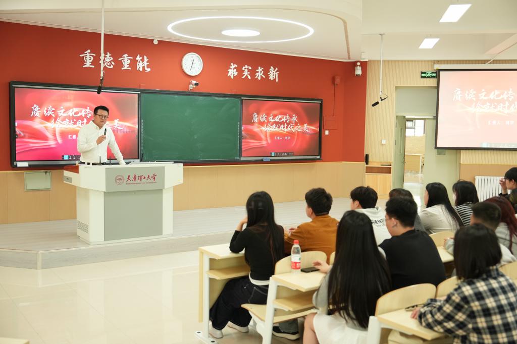 他深入解读了习近平总书记视察天津重要讲话精神,围绕落实“以文化人、以文惠民、以文润城、以文兴业”重要要求,结合生动鲜活的案例,深刻阐述了文化在城市发展、社会进步以及个人成长中的重要作用。他表示,作为艺术学院的学生,肩负着传承和弘扬中华优秀传统文化的使命,在艺术创作与设计选题中,要牢牢立足天津深厚的地域文化底蕴,以艺术的语言讲好天津故事,展现天津魅力,让津派文化在新时代焕发新的生机与活力,进一步传递中国文化的开放、包容与创新精神。