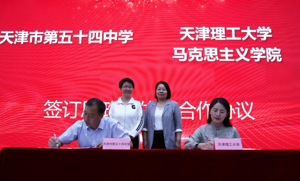在教联体签约仪式上,学院与天津市第五十四中学、天津市第四十五中学华英学校、天津市伯苓高级中学分别签订大中小学思想政治教育一体化合作协议。
