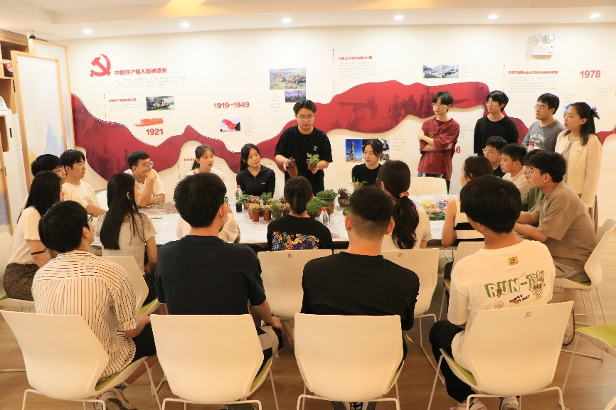 天津农学院辅导员、天津市十佳辅导员刘柳以《植物与新中国史》为题,讲授了微党课。他以国徽上的小麦、东方神药青蒿素、航天助力“农业芯片”等故事,生动再现了老一辈革命家、新时代科技工作者满怀信心、迎难而上的奋斗场景,激励广大师生要坚定理想信念、矢志拼搏奋斗。接着,师生分组开展红色微景观设计大赛,以植物微景观的艺术形式,展示了历史上的重大事件。在园林专业同学的讲解下,师生很快掌握了植物微景观制作步骤及日常养护技巧。