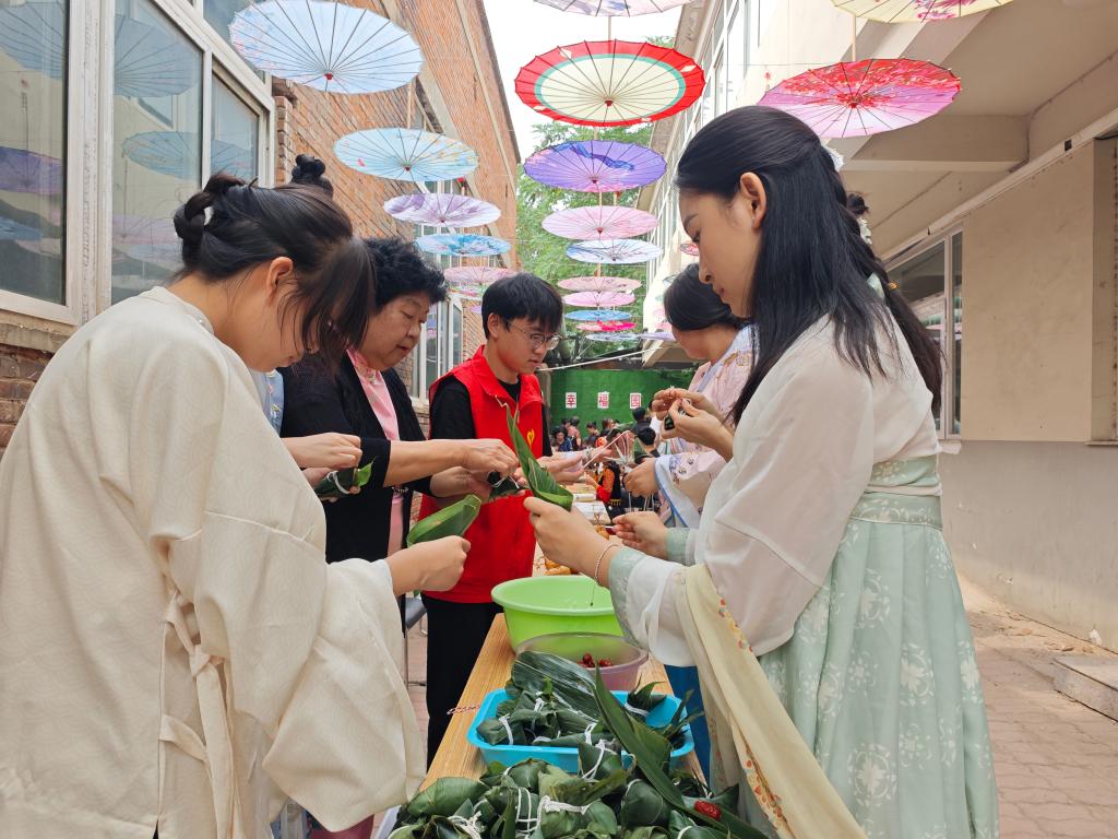 志愿者和社区居民一同清洗、整理糯米、粽叶、蜜枣,交流包粽子的方法,大家有说有笑,其乐融融。与此同时,志愿者还摆出五彩绳编制、扇画绘制、投壶等摊位,与社区居民、小朋友共同做手工、玩游戏,带领大家一起感受端午节浓浓的传统文化氛围。