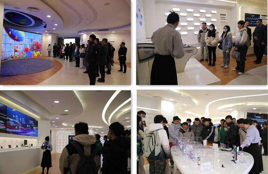 在维信诺科技股份有限公司,公司相关负责人介绍了公司的基本情况、发展历程及企业未来发展规划。学院师生观看了公司发展历程短片,参观了各代显示屏模组,体验了可弯折手机屏、透明显示屏、不规则显示屏等新型显示样品,还参观了阵列生产车间——阵列厂房,工作人员向师生详细介绍了智能化生产车间和成品制备工艺。高度自动化的生产车间让同学们深受震撼,深度了解了所学专业未来就业方向,进一步明确了职业规划。
