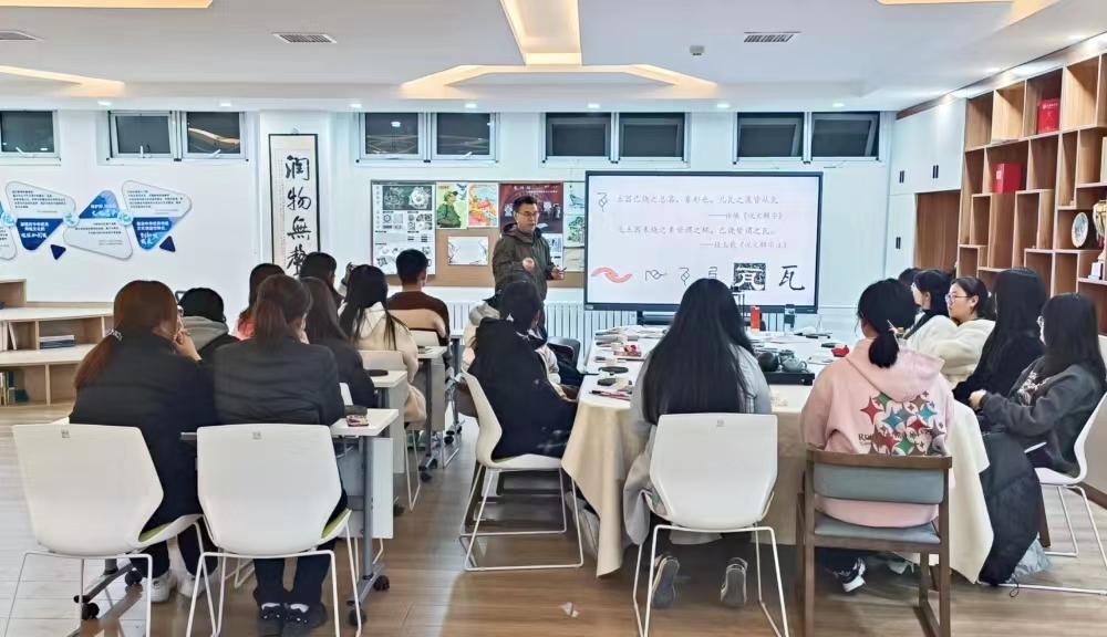 活动中,白凯借用许慎《说文解字》与段玉裁《说文解字注》中对于“瓦”字的注释,向同学们细致讲解了“瓦”字的结构与意义,并展示了甲骨文、小篆等形态的“瓦”字。随后,他向同学们展示了从秦汉时期到清朝的瓦当样式,展现了不同时期的审美倾向在瓦当上留下的鲜明烙印。在介绍瓦当历史的同时,他用幽默通俗的语言介绍了瓦当“四灵”——白虎、青龙、玄武、朱雀(四只神兽分别代表金木水火),与同是中华优秀传统文化代表的瓦当相结合,形成了独树一帜的瓦当文化。