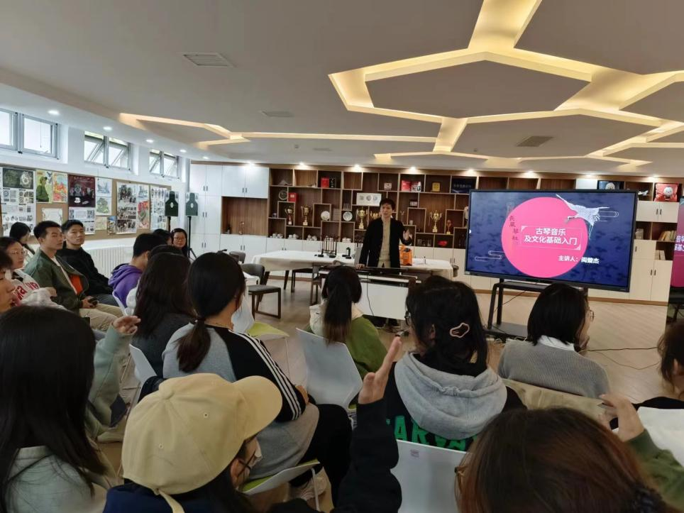 阎璧杰以风趣幽默、通俗易懂的语言将古琴的构造和种类娓娓道来,带领同学们深入了解古琴历史文化,感悟伯牙子期初遇时的惺惺相惜、孔子三学《文王操》的锲而不舍等古琴趣事,让师生与历代文人墨客产生了共鸣。他还解读了古琴九德、记谱方式等相关基础知识,帮助同学们深刻、全面了解古琴的音乐风格和艺术价值,并现场演奏古琴,为同学们带来了一场精彩的视听盛宴。现场同学积极互动交流,探讨了古琴艺术传承的相关问题。