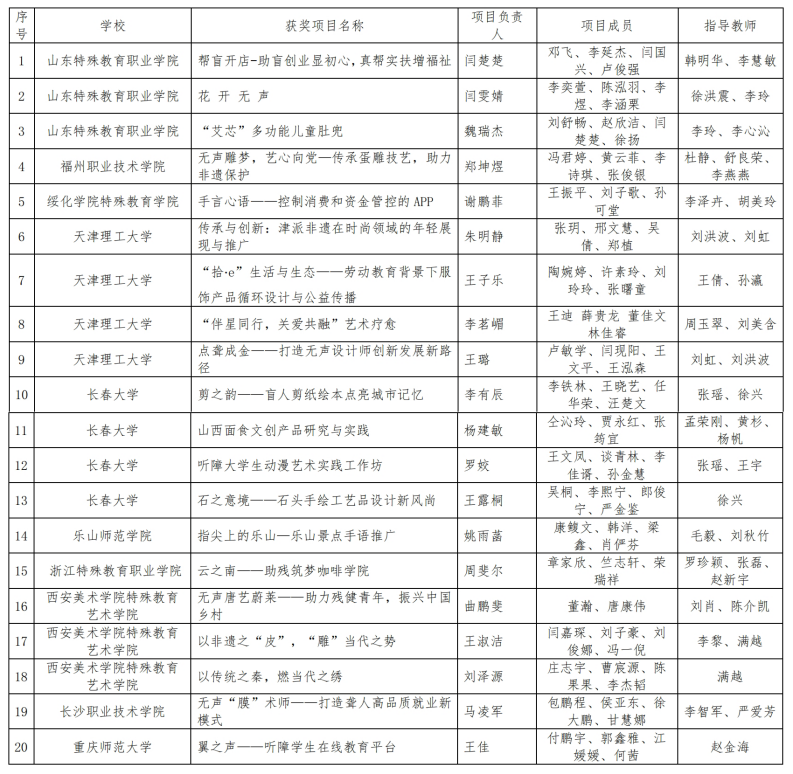 第二届全国残疾大学生创新创业竞赛文化创意和区域合作组晋级决赛名单