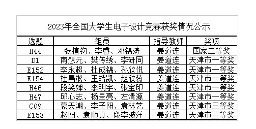 近日,2023年全国大学生电子设计竞赛获奖名单公示,集成电路科学与工程学院喜获佳绩,斩获全国二等奖1项,天津市一等奖5项,天津市三等奖2项。