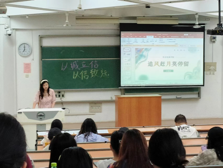 在分享会上,杜雁青同学介绍了国家、学校的相关资助政策和米兰的相关奖学金和勤工助学岗位情况,为与会同学进行了金融、征信知识普及。她用“探索、前行、奔赴、体验”分别概括大学四年的经历,通过和同学们分享自己的个人经历,带领同学们一同感受党和国家的资助关怀。在分享过程中,她还向同学们推荐优秀红色影片、书籍、纪录片、综艺节目等,就“内卷”问题提出自己的解决方法,并鼓励同学们增强自信,努力奋进,心怀感恩,主动与老师同学交流,积极参加学校学院活动,开阔自己的眼界,拓展自己的视野,增强自信心,不断在实践中提升个人能力,通过自己的努力改变人生命运。