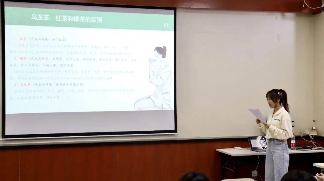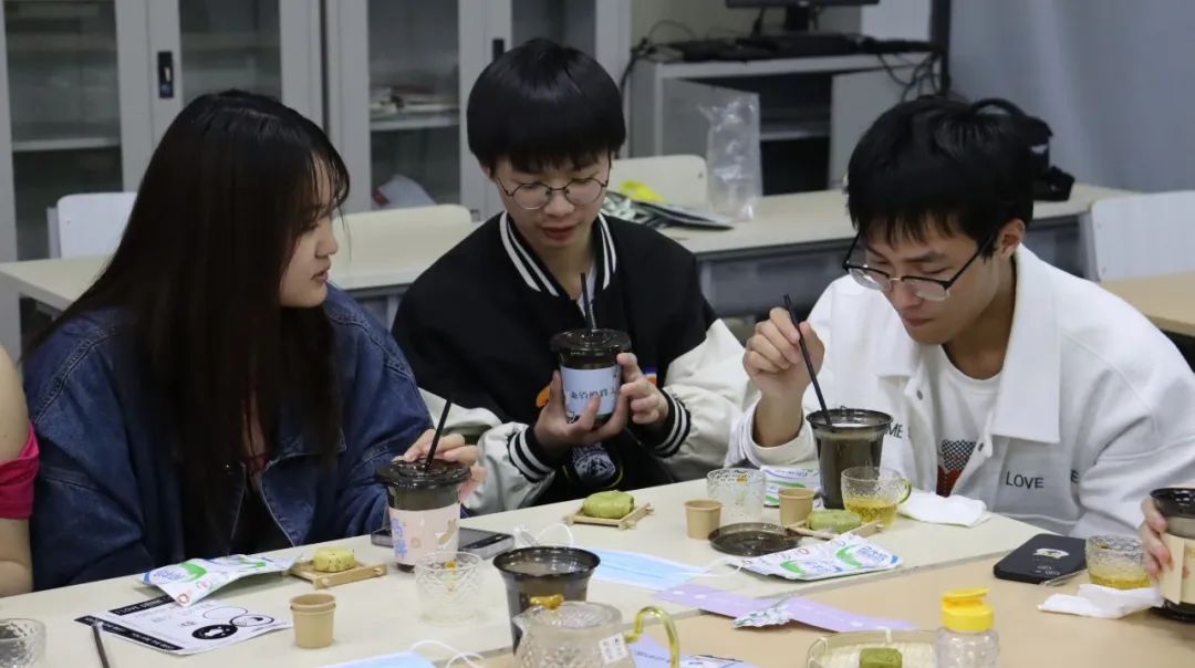 活动伊始,主讲人韩舒薇讲述了红茶、绿茶以及乌龙茶三种茶的产地、功效以及它们在口感、制作流程方面的区别等内容,帮助同学们对茶知识有了更加深刻的记忆。本次活动设置了“闻香识茶”与“你画我猜”两个比拼环节,同学们就茶相关的知识进行抢答竞猜,在欢愉的氛围中自觉了解更多的茶文化。随后,同学们以茶、牛奶为原材料,根据自己的口味进行创意奶茶的制作,感受现代文化与传统文化碰撞的魅力。