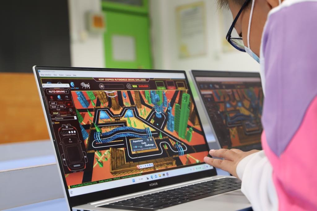 张鹏老师根据学生特点和接受能力,精心设计“酷思倍编程分享”课程内容,从赛事宣传、RoboCup机器人世界杯赛项介绍、酷思倍编程教学三个方面循序渐进,组织科普和领学,带领学生体验智能小车模拟系统,感受人工智能的奥秘,课程激发了学生对智能小车编程的学习热情。
