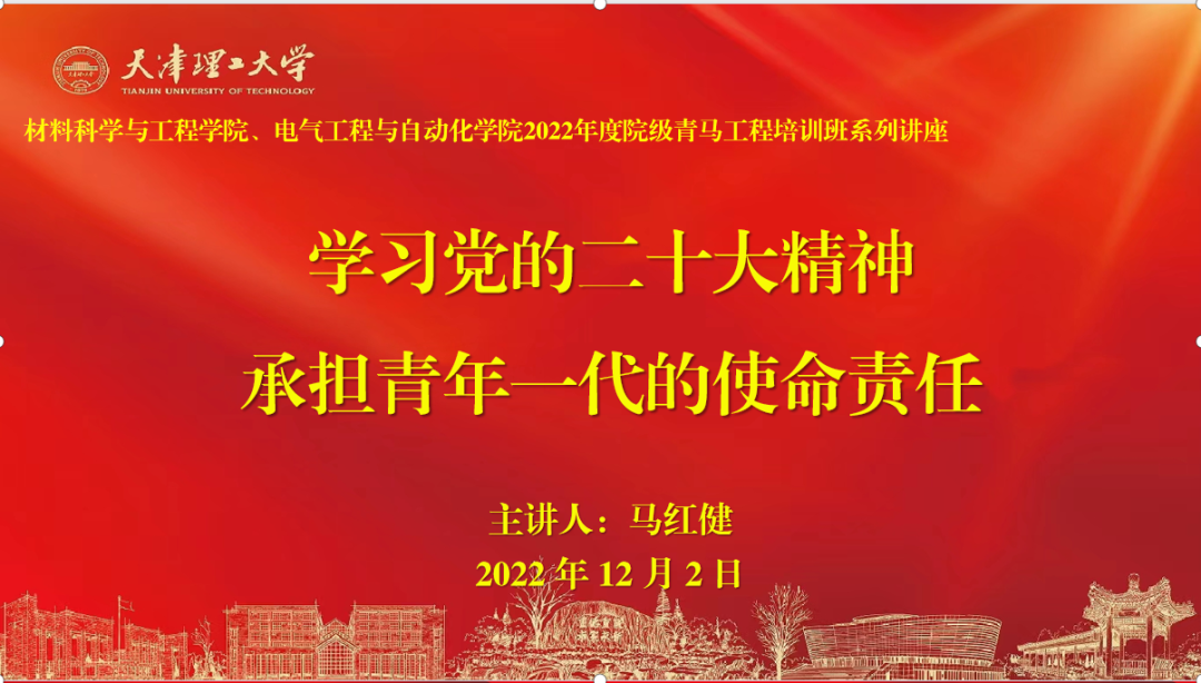 为进一步推动学习宣传贯彻党的二十大精神,引导青年深刻领会和准确把握党的二十大提出的新思想、新论断,作出的新部署、新要求。近日,材料科学与工程学院邀请全国教育系统先进工作者,老马工作室负责人马红健老师以“学习党的二十大精神,承担青年一代的使命责任”为主题,面向材料学院院级青马工程培训班成员及入团申请人以线上线下相结合的方式开展讲座。