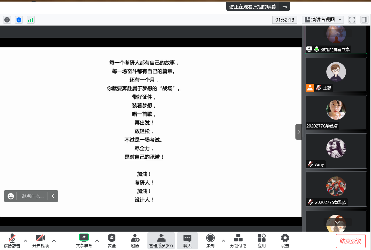 活动中,分别来自学院三个研究生教育方向的硕导、助理硕导们在轻松愉悦的氛围下,深入浅出地与同学们分享考研形势、前期准备、心理调适、冲刺期复习重点等内容,特别针对设计学科的特点,通过案例点评、经验分享等着重讲述两门专业课程的复习策略和注意事项,为同学们今后的备考学习指明方向。最后,一首由学院师生团队自编自导的《设计史学习歌》,在为备考学子指点迷津的同时,鼓励同学们沉着应考,取得好成绩。