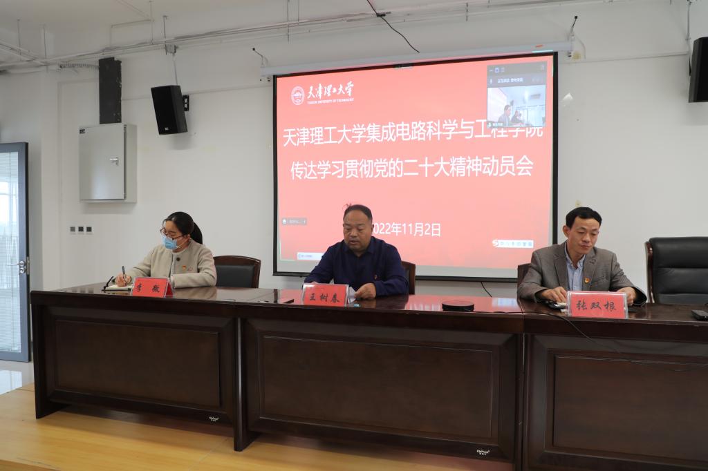 会议号召全体党员、干部、师生要深刻领会党的二十大的重大现实意义和深远历史意义,切实增强学习贯彻党的二十大精神的政治自觉、思想自觉和行动自觉。立足岗位,创新竞进,以崭新的面貌和蓬勃的力量,将新精神新思想转化为攻坚克难、砥砺前进的强大动力。立足于高水平科技自立自强,坚定不移履行主体责任,引导师生团结奋斗,勇攀科技高峰,融合学院事业发展,继续锚定学院“十四五”规划和发展愿景,起好步、加好速,立足机遇,以申报博士点为契机,依托天津市半导体集成电路人才创新创业联盟,持续联手飞腾信息技术公司等爱国企业,深化“集智飞腾”爱国主义基地建设内涵,坚持“一生一芯”人才培养规划,大力培育自主创“芯”人才。